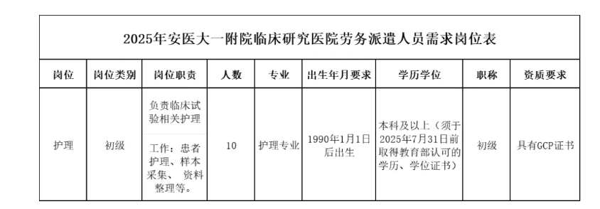受安徽医科大学第一附属医院委托,为满足安徽医科大学第一附属医院临床研究医院工作需要,安徽易德人力科技股份有限公司承接其劳务派遣临床研究医院的招聘相关工作,拟通过我司招聘劳务派遣人员10名,现将有关情况公告如下: