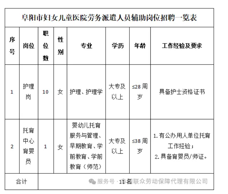 本次招聘采取劳务派遣服务方式,由阜阳市联众劳动事务保障代理有限公司负责全部招聘流程,招聘完成后将派遣至阜阳市妇女儿童医院上岗工作。