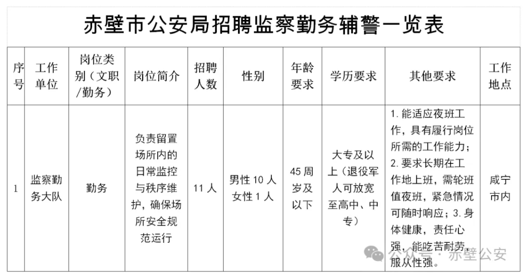 本次计划公开招聘监察勤务辅警11名。具体招聘岗位、人数等详见附件《赤壁市公安局招聘监察勤务辅警一览表》。