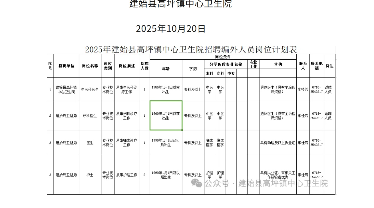 根据医院各科室人员需求和业务发展情况,本次计划招聘医生3名、护士2名,具体岗位及要求详见附件《2025年建始县高坪镇中心卫生院招聘编外人员岗位计划表》。