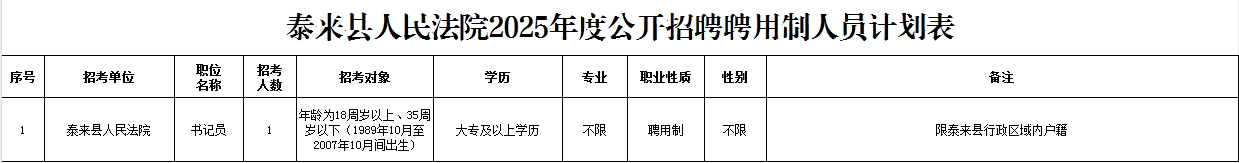 因工作需要,泰来县人民法院面向社会公开招聘聘用制人员1名。现将有关事项公告如下: