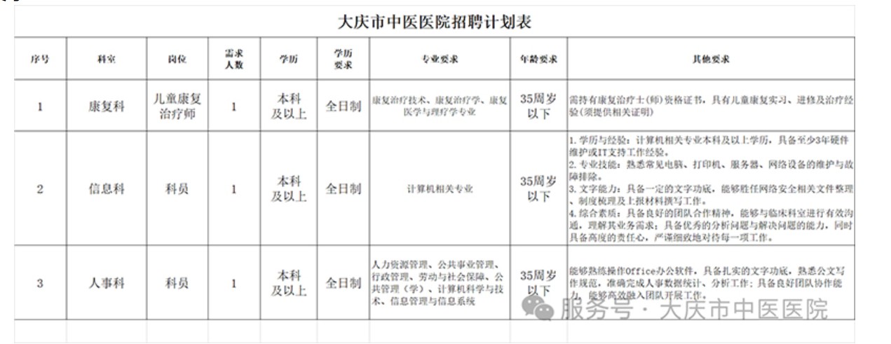 因工作需要,现大庆市中医医院拟招聘工作人员,具体要求如下: