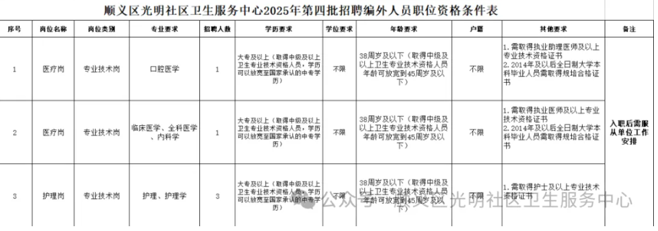 顺义区光明社区卫生服务中心是一所一级甲等医疗机构,坐落于顺义区府前东街大东路2号,承担辖区内滨河、东兴、裕龙、金汉绿港等18个社区,共计约7万居民的医疗卫生服务。根据我中心发展需要,加快人才队伍建设,优化人力资源结构,现面向社会公开招聘编外人员,具体事项如下: