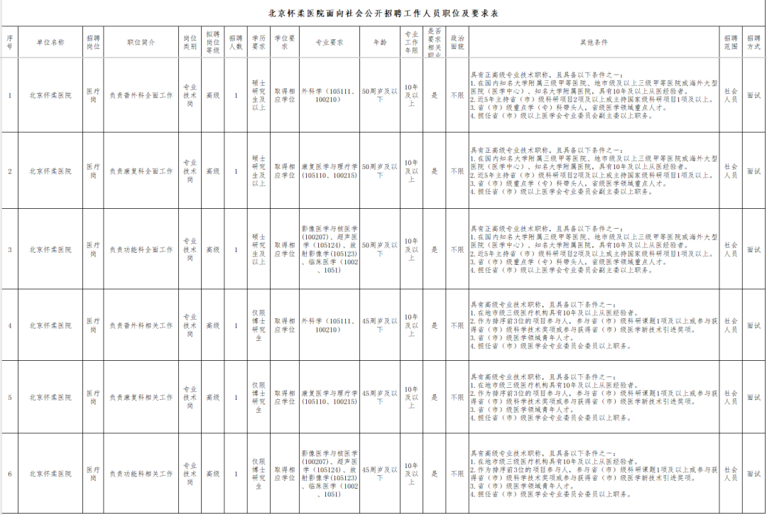 (一)具体岗位设置及招聘人数详见北京怀柔医院面向社会公开招聘工作人员职位及要求表。