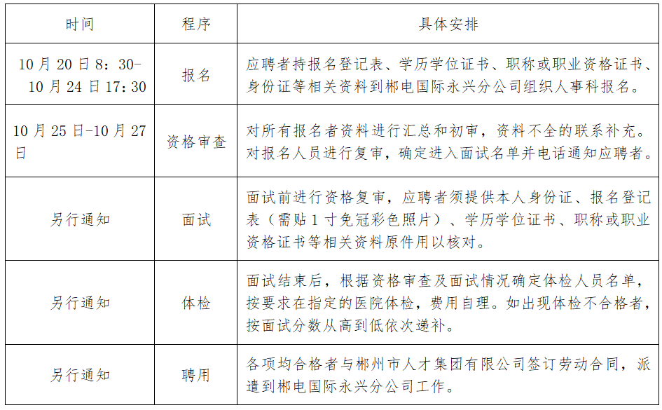 根据公司经营业务工作需要,湖南郴电国际发展股份有限公司永兴分公司公开招聘劳务派遣人员7名,具体事项公告如下: