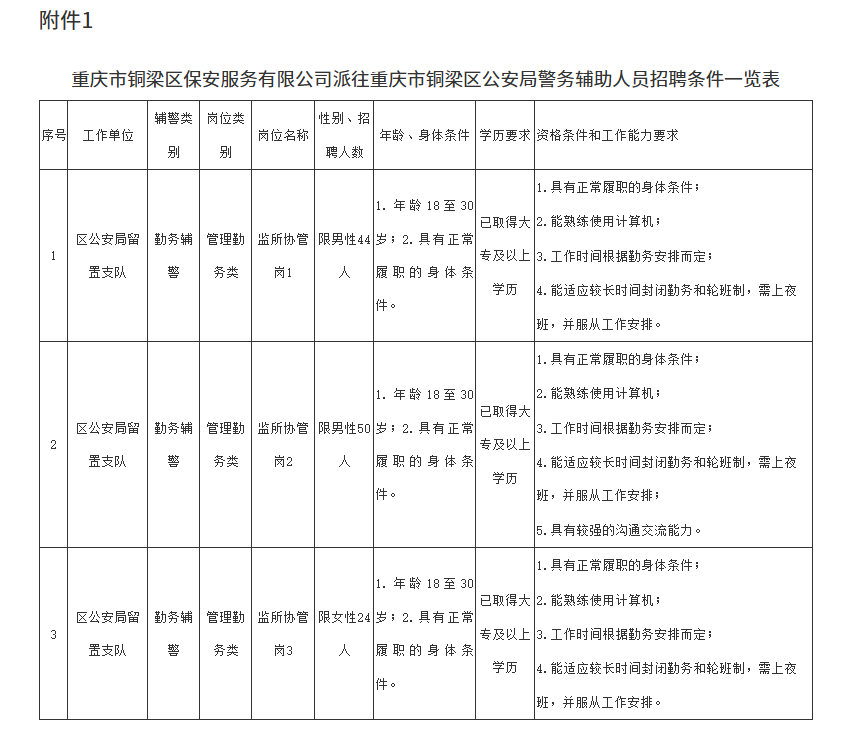 招聘职位、人数及条件详见附件1《重庆市铜梁区保安服务有限公司派往重庆市铜梁区公安局警务辅助岗位工作人员招聘条件一览表》。