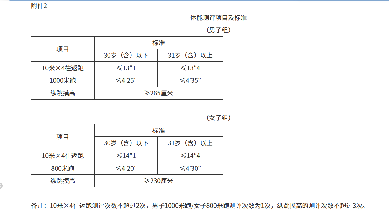 2.体能测试参照《公安机关录用人民警察体能测评项目和标准》(公政治〔2024〕60号)规定执行。体能测试年龄计算时间截止到参加体能测评当月。体能测试项目为10米×4往返跑、1000米、纵跳摸高3项,全部达标的为合格,其中1项不达标的为不合格。体测标准详见附件2。