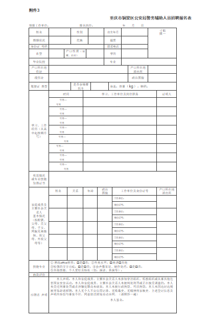 3.应聘所需材料:身份证、学历证书、退伍证、报考岗位相关资格认证证书原件和复印件各1份,一寸红底或蓝底照片3张、本人户籍证明或居住证明。应聘人员资格审查前需自行下载打印《警务辅助人员报名表》,应聘人员只能选择一个岗位。在职人员需出具所在单位同意报考证明。