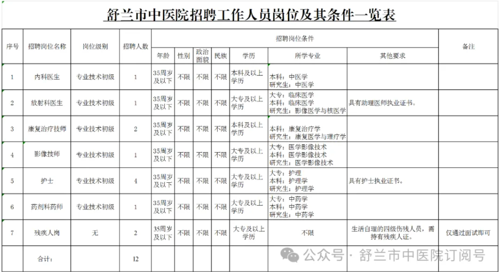 本次舒兰市中医院计划招聘工作人员12名,以劳务派遣形式参加工作,具体招聘岗位、人数及其条件详见《舒兰市中医院招聘工作人员岗位及其条件一览表》(附件1)。