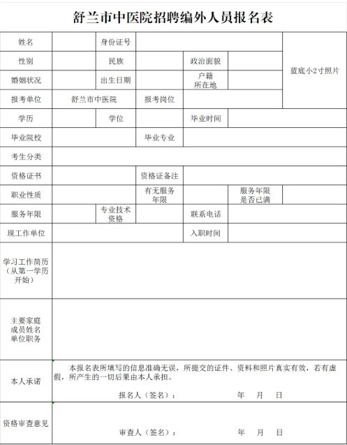 报名者须填写《舒兰市中医院招聘工作人员报名表》(附件2),并携带本人有效居民身份证、毕业证、学位证、执业资格证、专业技术资格证等相关证件原件及复印件二份,近期(6个月内)蓝底正面小2寸免冠照片1张。