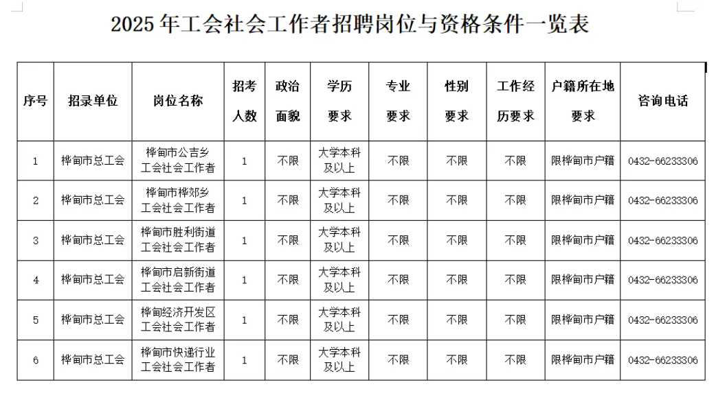 1.本次招聘6名工会社会工作者,具体岗位、资格条件及咨询电话等详见《2025年工会社会工作者招聘岗位与资格条件一览表》(附件1)。