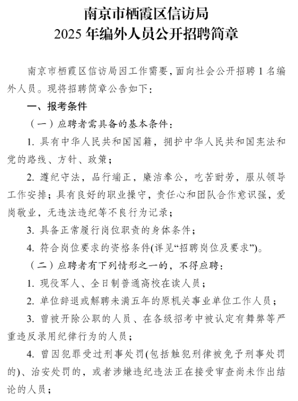 南京市栖霞区信访局2025年编外人员公开招聘简章