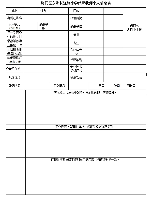 1.下载《海门区东洲长江路小学代课教师个人信息表》并填写完整;身份证正反面、学历学位证书、教师资格证、普通话等级证书、荣誉证书等复印件交校长办公室。