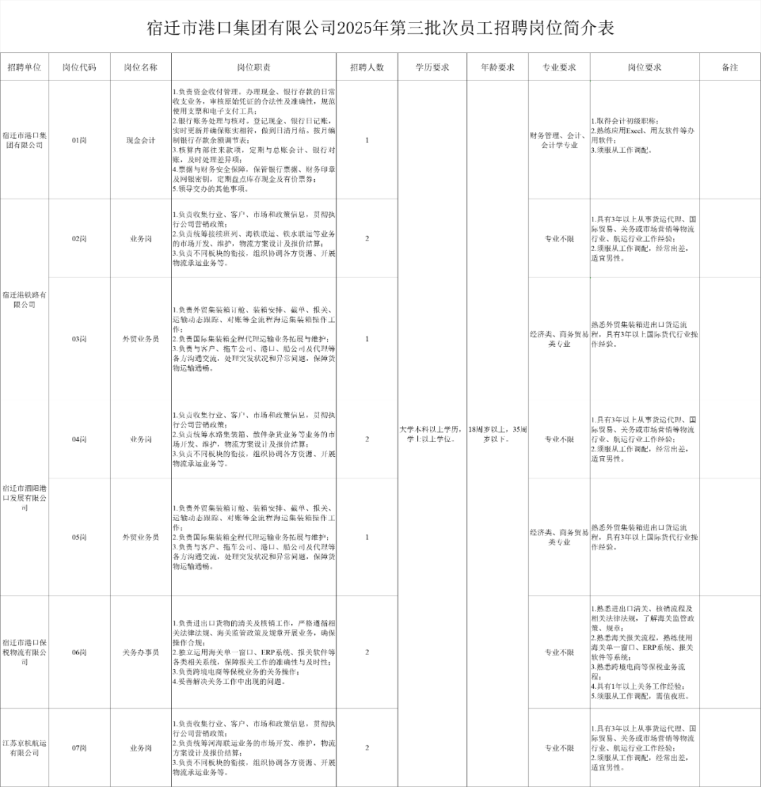 招聘单位、岗位及相关要求等内容,详见附件《宿迁市港口集团2025年第三批次员工招聘岗位简介表》(以下简称《岗位表》)。