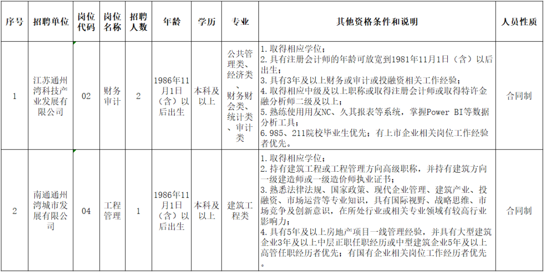 招聘岗位。详见《通州湾示范区区属国企及下属子公司公开招聘岗位简介表》,招聘岗位条件中有工作经历要求的,时间截止2025年11月(含)前的累计工作经历(按月计算)。