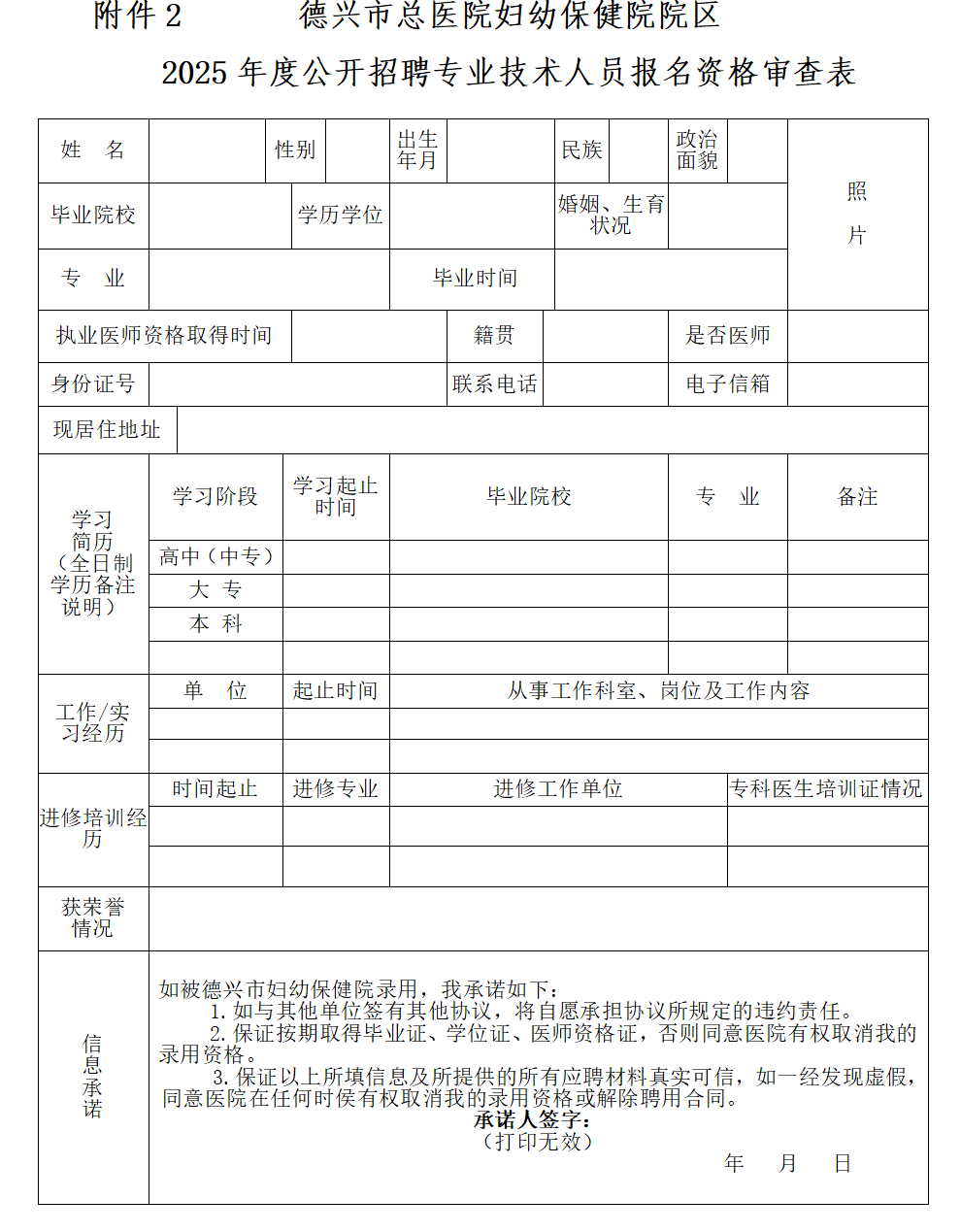 3.审查材料:《德兴市总医院妇幼保健院院区2025年度公开招聘专业技术人员报名资格审查表》(需本人签名)、身份证原件及复印件、大专毕业证、本科或硕士毕业证原件及复印件、学位证原件及复印件、学信网《教育部学历证书电子注册备案表》、执业医师资格证原件及复印件、工作经历证明原工作医院社保缴费证明或者原医院工资银行流水单原件及复印件。