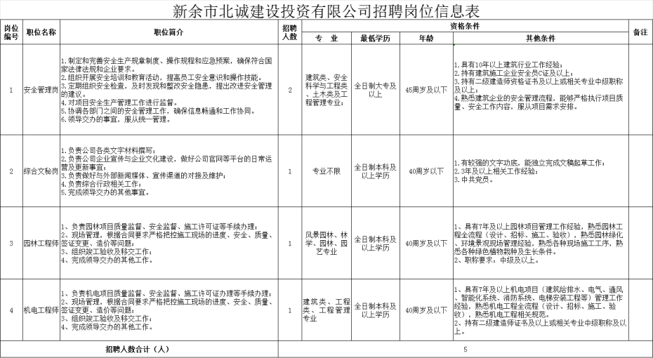 新余市北诚建设投资有限公司本次公开招聘安全管理岗2名,综合文秘岗、园林工程师、机电工程师各1名,共计5名。招聘岗位及职责、任职条件详见《新余市北诚建设投资有限公司招聘岗位信息表》。