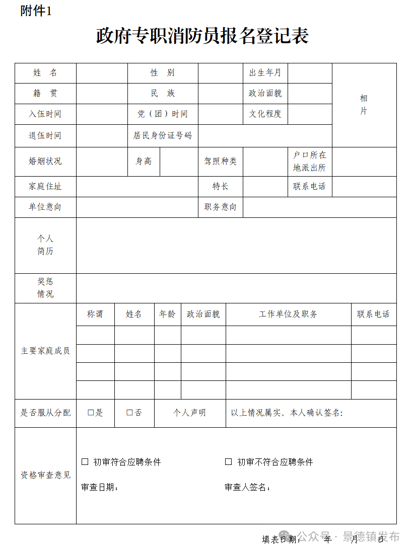 3.相关要求:凡符合条件、有意应聘者,可持本人居民身份证、学历证书、学位证书、学历认定证明或学历证书电子注册备案表、征信报告、近期一寸正面免冠彩色照片2张,以及相关岗位要求的证书(退伍证、消防员证、B2及以上驾驶证)等原件及复印件一份到景德镇市消防救援支队报名点报名。