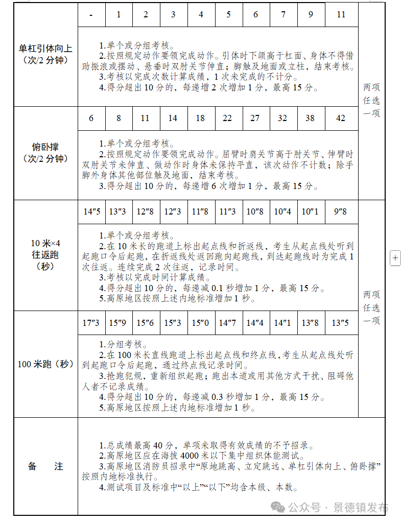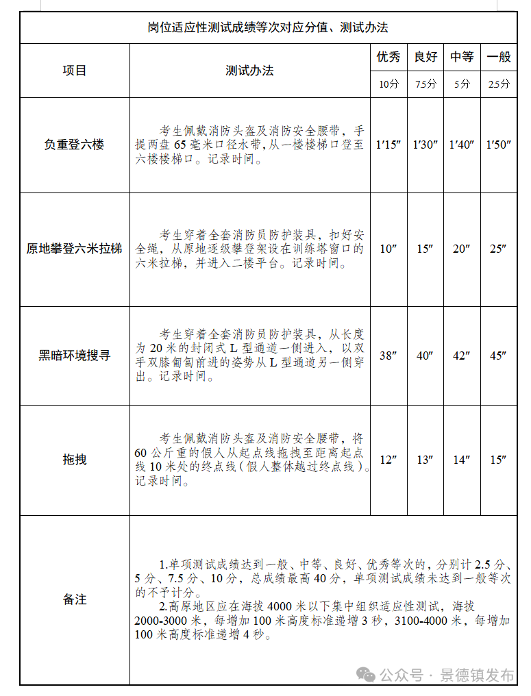 按照《国家综合性消防救援队伍2025年度消防员招录体能测试、岗位适应性测试项目及标准》执行,均实行量化评分。其中:体能测试单项有效成绩为1分~15分,总成绩最高40分;岗位适应性测试单项测试成绩达到一般、中等、良好、优秀等次的,分别计2.5分、5分、7.5分、10分,总成绩最高40分,单项测试成绩未达到一般等次的不予计分。驾驶员和接警调度员增加专业技术岗位测试内容,其中驾驶员测试内容为坡道定点起步、倒车入库、侧方停车;接警调度员测试内容为普通话水平考试和计算机文字速录考试。