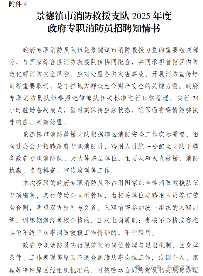 为满足景德镇市社会经济迅速发展对消防力量的需求,有效提升社会灾害防控能力,景德镇市消防救援支队按照德才兼备和“公开、平等、竞争、择优”的原则,面向社会公开招收43名政府专职消防员(男性),充实到全市各级消防救援单位。现将有关事项公告如下: