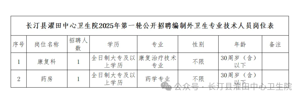 1.招聘岗位具体条件详见《长汀县濯田中心卫生院2025年第一轮公开招聘编制外卫生专业技术人员岗位表》(以下简称《岗位表》,详见附件1)。