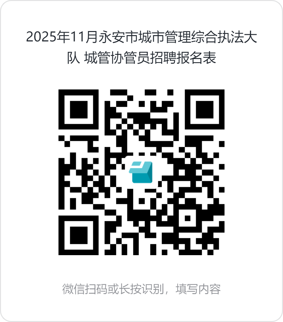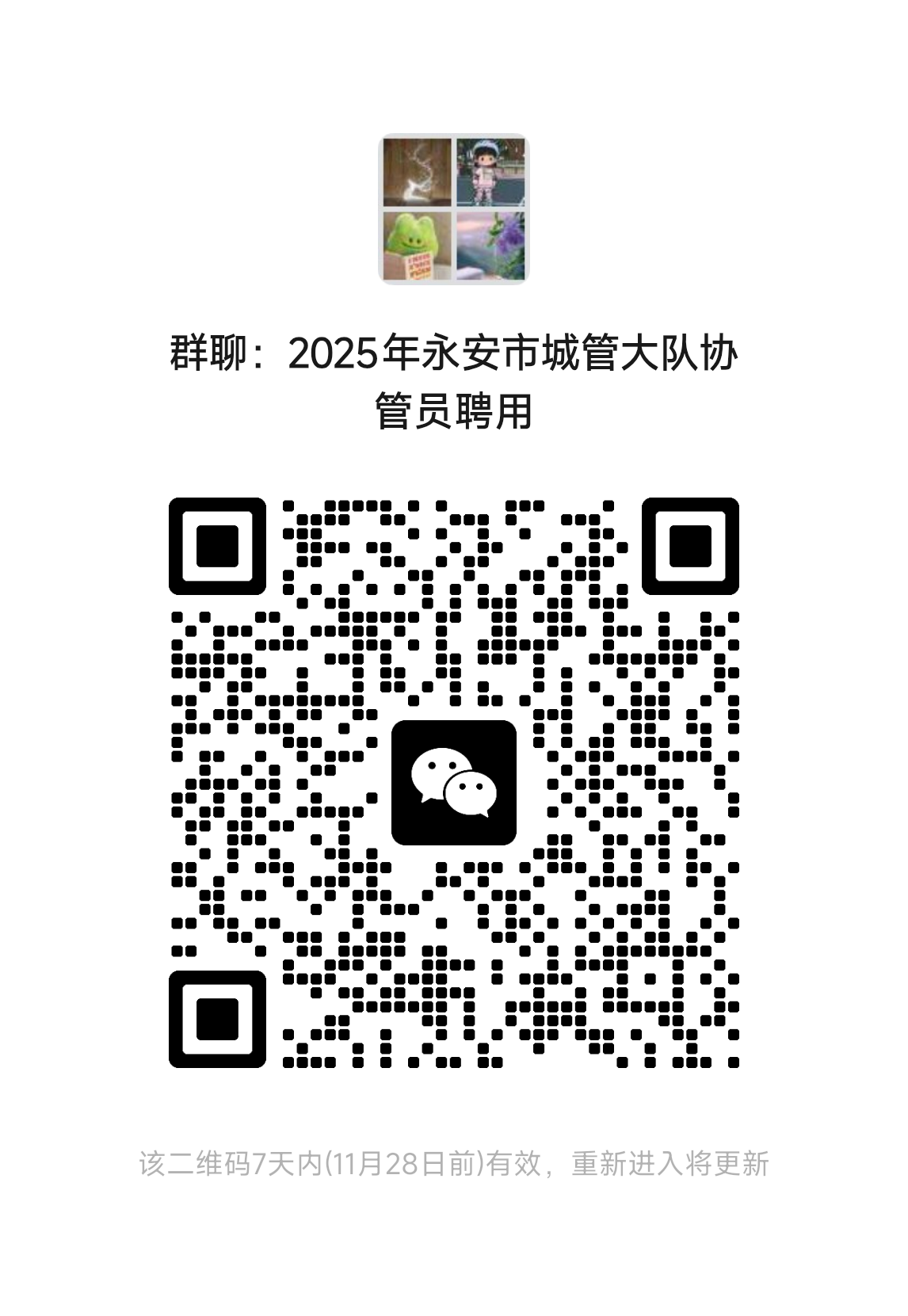 3.信息填写后,通过扫描下方微信群“2025年永安市城管大队协管员聘用”二维码入群,入群后请将本人群昵称改为“姓名+联系方式”格式,相关通知后续在该群中发布,不得泄露个人信息及群内信息,否则承担相关法律责任。