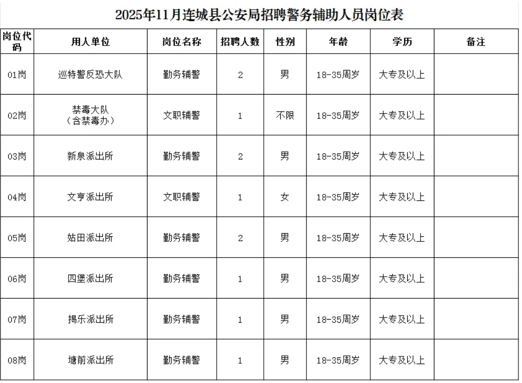 因工作需要,连城县公安局面向社会公开招聘警务辅助人员(简称“辅警”),现将有关事项公告如下: