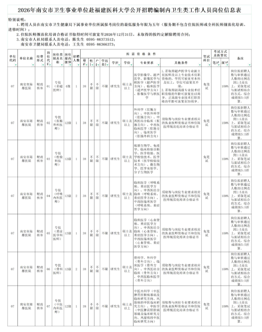 详情点击:2026年南安市卫生事业单位赴福建医科大学公开招聘编制内卫生类工作人员公告