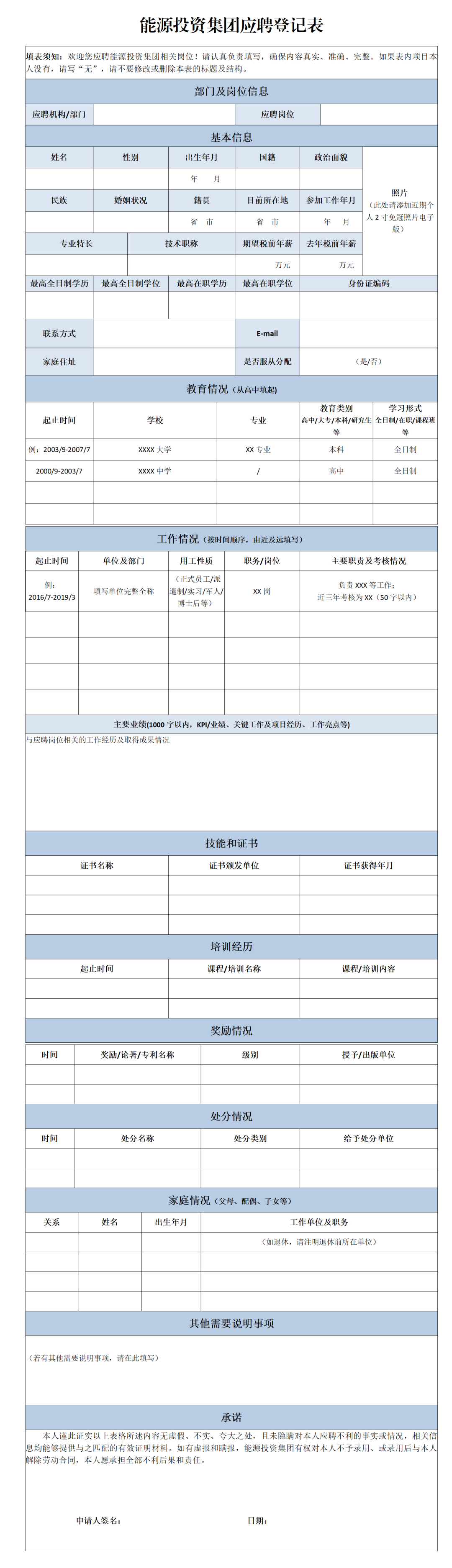 报名实行诚信承诺制,应聘者在《能源投资集团应聘登记表》承诺一栏签字即视为承诺填报的信息真实有效,如发现虚报材料者,随时取消其考试或聘用资格。