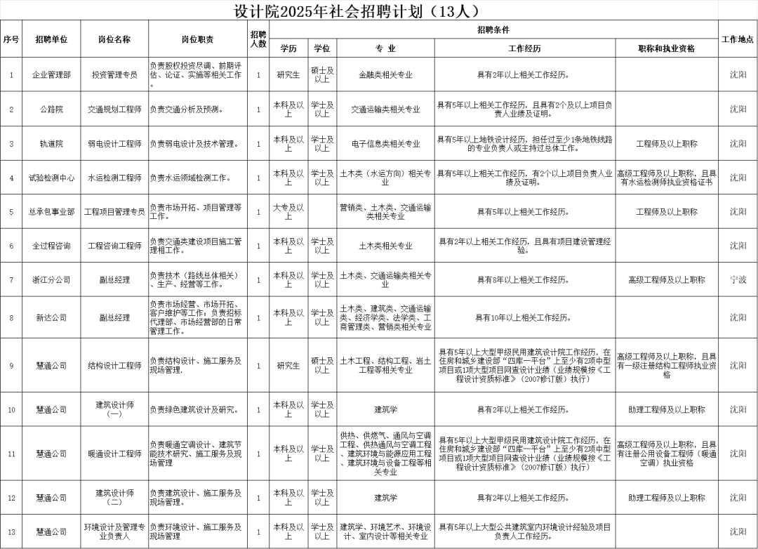 为满足业务发展需要,设计院及下属公司拟面向社会招聘13名工作人员,现公告如下: