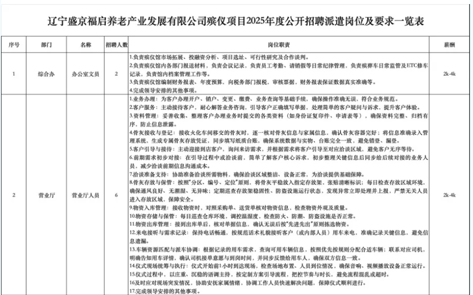 *相关岗位要求详见《辽宁盛京福启养老产业发展有限公司殡仪项目2025年度公开招聘派遣岗位及要求一览表》及报名网址内详情。
