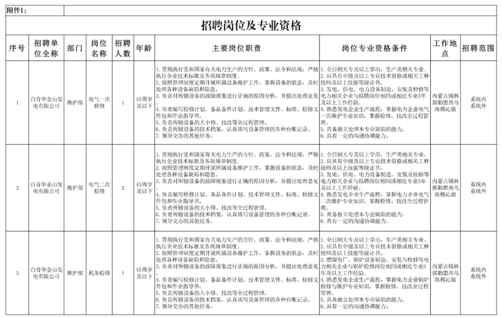白音华金山发电有限公司一期工程建设2×600MW亚临界直接空冷燃煤发电机组,于2010年9月实现双投;新能源“7+24”万千瓦风电项目已开工建设,计划于2025年底投产发电。为满足项目发展和生产需要,拟面向华电系统内外公开招聘4名工作人员,有关招聘事项公告如下: