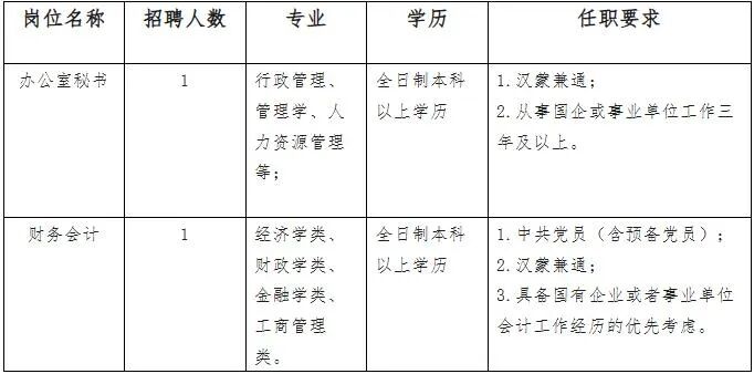 阿巴嘎旗沃格德资产投资有限公司,为国有独资企业,注册资金500万元。根据公司业务发展需求,现面向社会招聘2名工作人员: