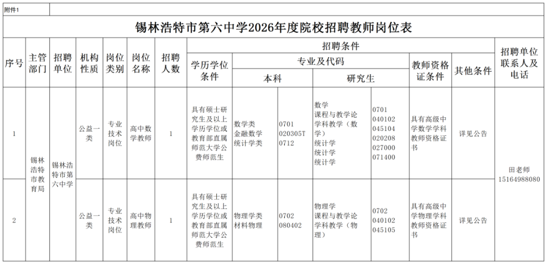 根据《内蒙古自治区关于进一步完善中小学教师公开招聘长效机制的指导意见》(内教发〔2021〕14号)、《内蒙古自治区事业单位公开招聘人员办法》(内人社发〔2022〕2号)、《关于启动2026年全区事业单位公开招聘工作的通知》(内人社发〔2025〕21号)等规定,现将锡林浩特市第六中学2026年度赴内蒙古师范大学招聘教师有关事项公告如下: