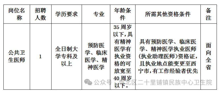 为进一步充实人才队伍,提升医疗服务水平,西宁市城北区二十里铺镇民族中心卫生院因工作需要,现面向社会公开招聘编制外人员公共卫生医师1名,现将具体事项公告如下: