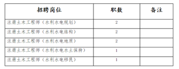 | 1 | 注册土木工程师 (水利水电-规划) | 2 | (一)政治立场坚定,拥护中国共产党领导,深刻领悟“两个确立”的决定性意义,增强“四个意识”、坚定“四个自信”、做到“两个维护”; (二)具有良好的道德品质和敬业精神,诚实守信,有较强的事业心、责任感和自我约束力;遵纪守法、品行端正、廉洁从业、团结合作、作风严谨,无不良从业行为记录,自觉维护企业合法权益; (三)熟悉国家政策和行业法律法规,具有丰富的管理知识和实践经验,具有胜任岗位的组织协调能力、学习能力、专业素养、心理素质和正常履职的身体条件; (四)40岁及以下,全日制本科及以上学历,中级及以上职称,须持有注册土木工程师职业资格证,5年及以上专业工作经验,工作业绩特别优秀的,可适当放宽条件; (五)有以下情况之一的不得报名:因犯罪受过刑事处罚的人员;刑事处罚期限未满或涉嫌犯罪正在接受调查的人员;被开除中国共产党党籍或公职的人员;被依法列为失信联合惩戒对象的人员;因违规违纪受到党纪政纪处分的人员;正在接受纪律审查的人员;曾在国家公开招聘考试中被认定有舞弊等严重违反招聘纪律行为的人员;上一年度综合考核评价结果为基本称职及以下格次的人员等。 |