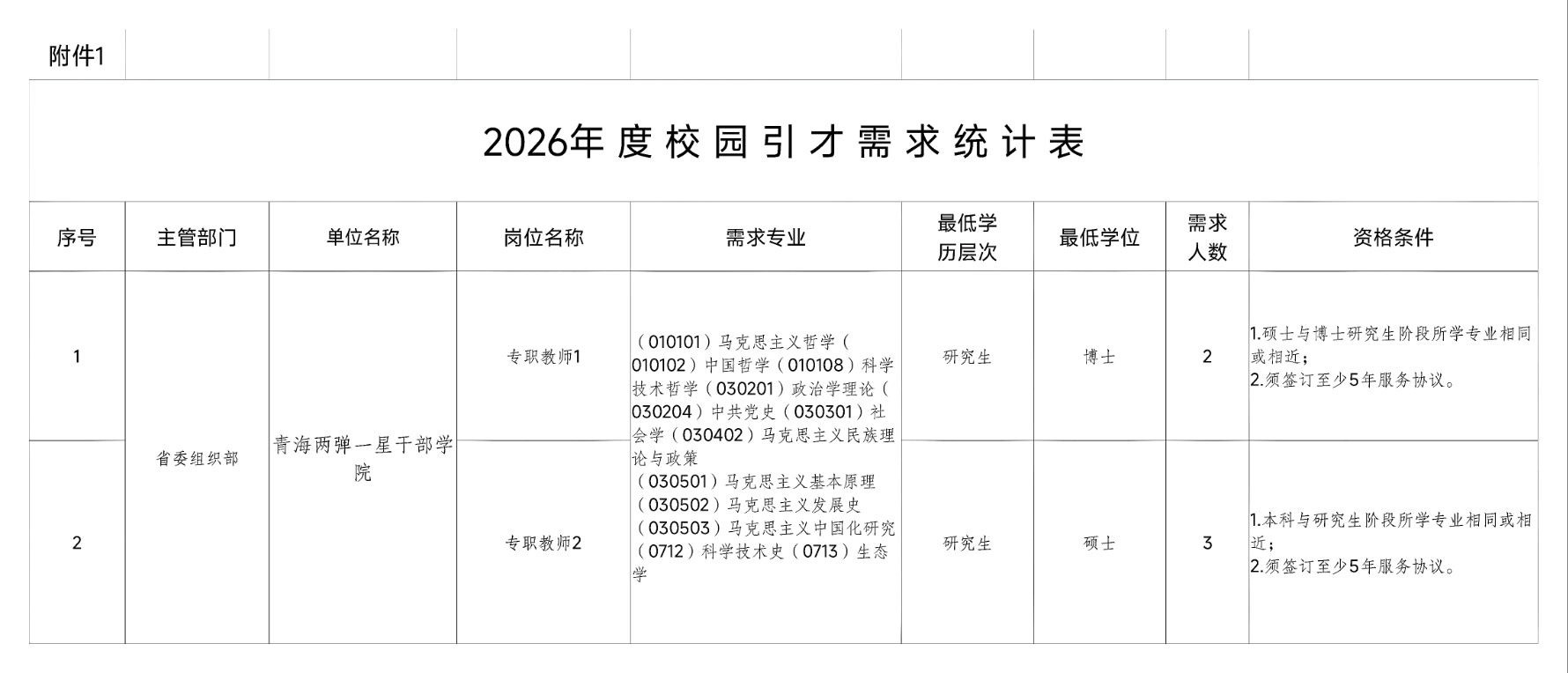 根据青海省委组织部、青海省人力资源和社会保障厅2026年校园引才工作部署,学院面向全国2026届高校毕业生引进急需紧缺人才5名。现将有关事项公告如下
