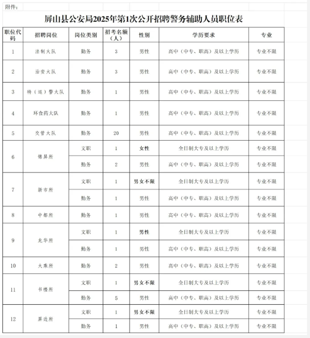 因工作需要,屏山县公安局决定面向社会公开招聘警务辅助人员(以下简称“辅警”),现将有关事项公告如下。
