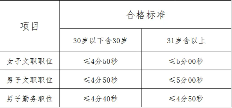 体能测试项目为男子1000米跑,女子800米跑体能测试合格标准见下表,测试次数只有1次。