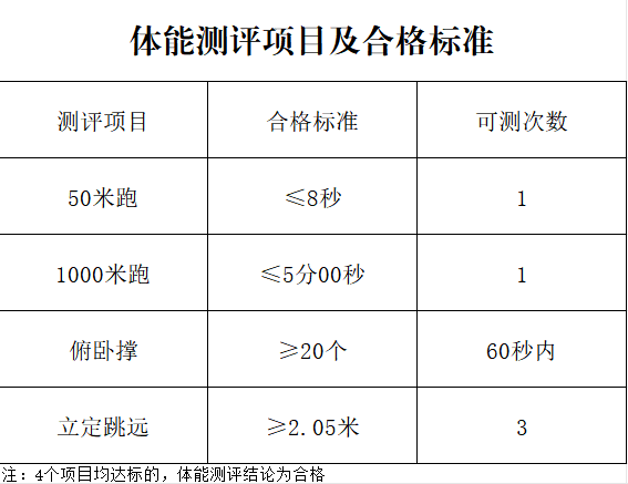 1.参测人员:所有参加面试的考生均参加体能测试,体能测试参照公安院校公安专业招生体能测评项目及标准设定达标标准,体能不达标,不能进入下一招聘环节。