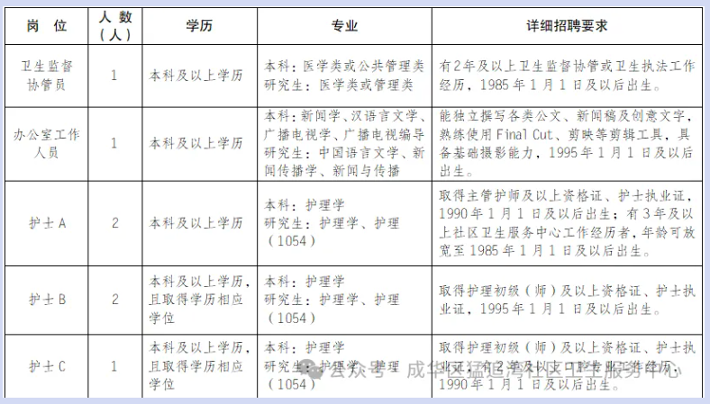 成华区猛追湾社区卫生服务中心是一家由成华区卫健局举办的公益性基层医疗卫生机构,是成都市第六人民医院的城市医疗集团单位。为充实中心人才队伍,按照“公开、平等、竞争、择优”的原则,现面向社会公开招聘7名编制外工作人员。现就有关事项公告如下: