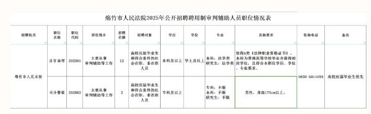 具体职位要求详见附件《绵竹市人民法院2025年招聘聘用制审判辅助人员职位情况表》。
