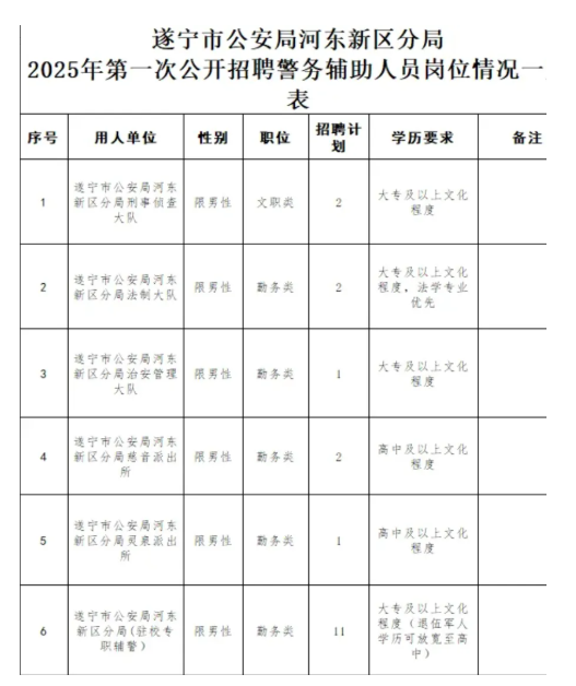 本次面向社会公开聘用警务辅助人员19名。招聘的具体岗位详见《遂宁市公安局河东新区分局2025年第一次公开招聘警务辅助人员岗位情况一览表》(附件1)。