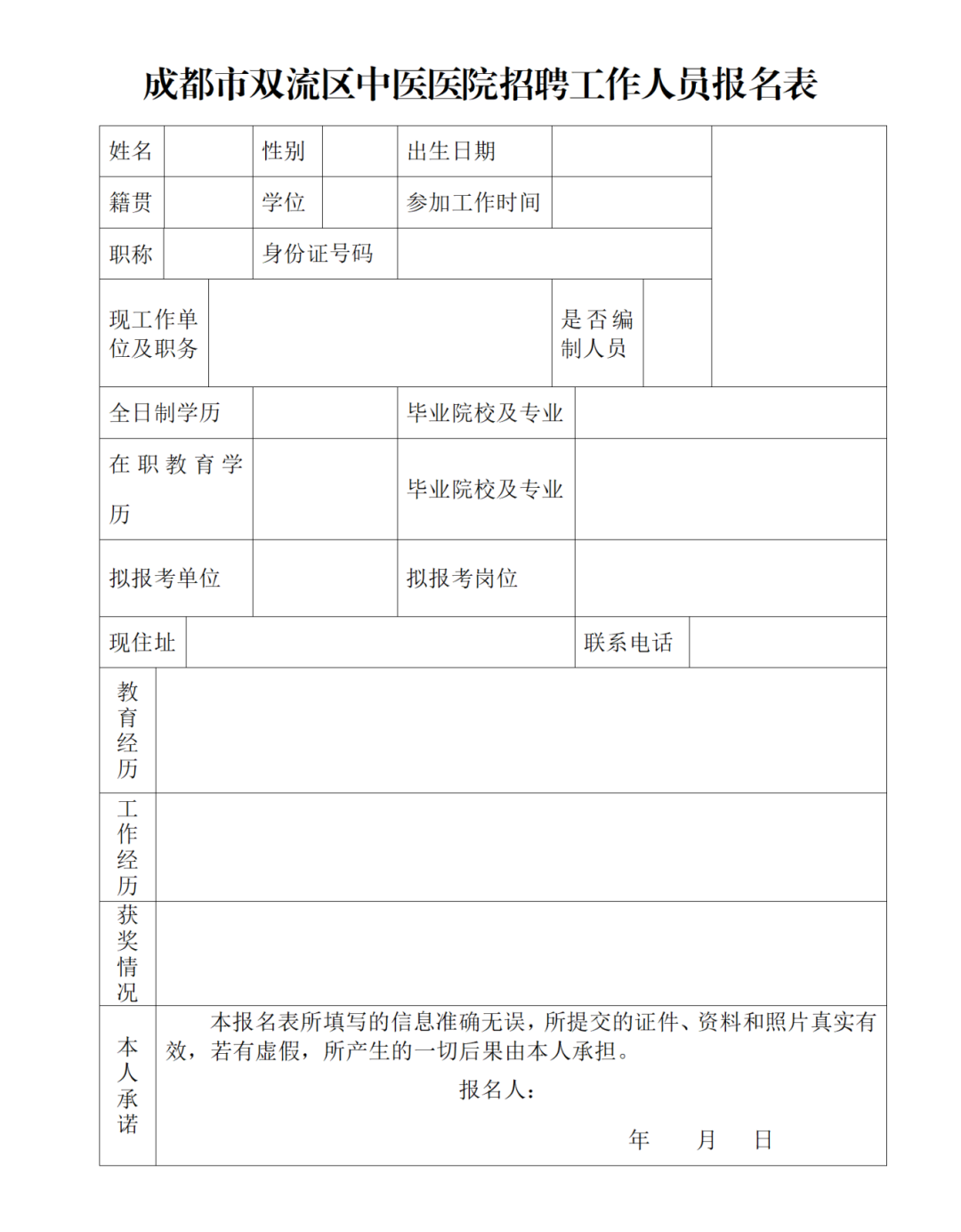 2.简历要求:个人信息完整,且包含身份证、毕业证、学位证、执业证、职称证、资格证、规培证明、学信网上打印含有二维码的《教育部学历证书电子注册备案表》等原件及复印件(如涉及专业方向,请出具相关专业证明),并提交《成都市双流区中医医院招聘工作人员报名表》。