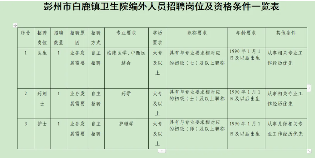 因业务发展需要,彭州市白鹿镇卫生院面向社会公开招聘医生1名、药剂士1名、护士1名。现将有关事项公告如下: