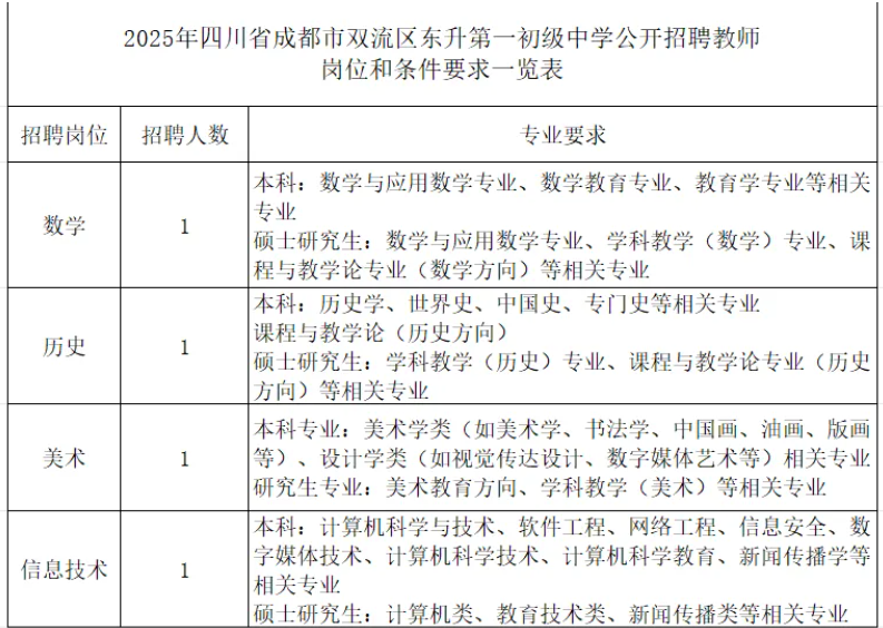 具体岗位和条件见《2025年四川省成都市双流区东升一中公开招聘教师岗位和条件要求一览表》
