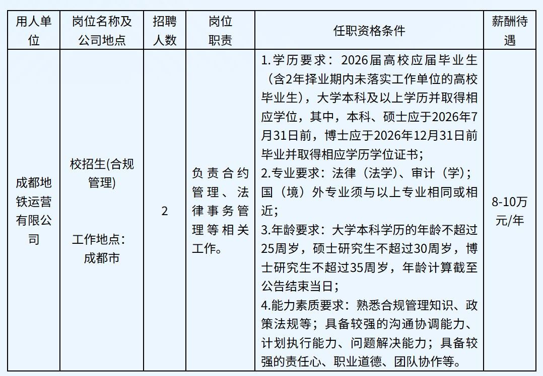报名链接:本次招聘统一通过智联招聘平台进行报名(报名网址:http://cdmetro.zhaopin.com/)。