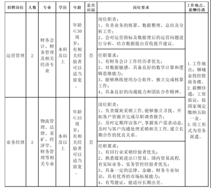 山东金投能源供应链有限公司为满足公司发展和工作需要,特委托聊城市鲁西人力资源开发有限公司面向社会公开招聘劳务派遣人员,现将招聘事项公告如下: