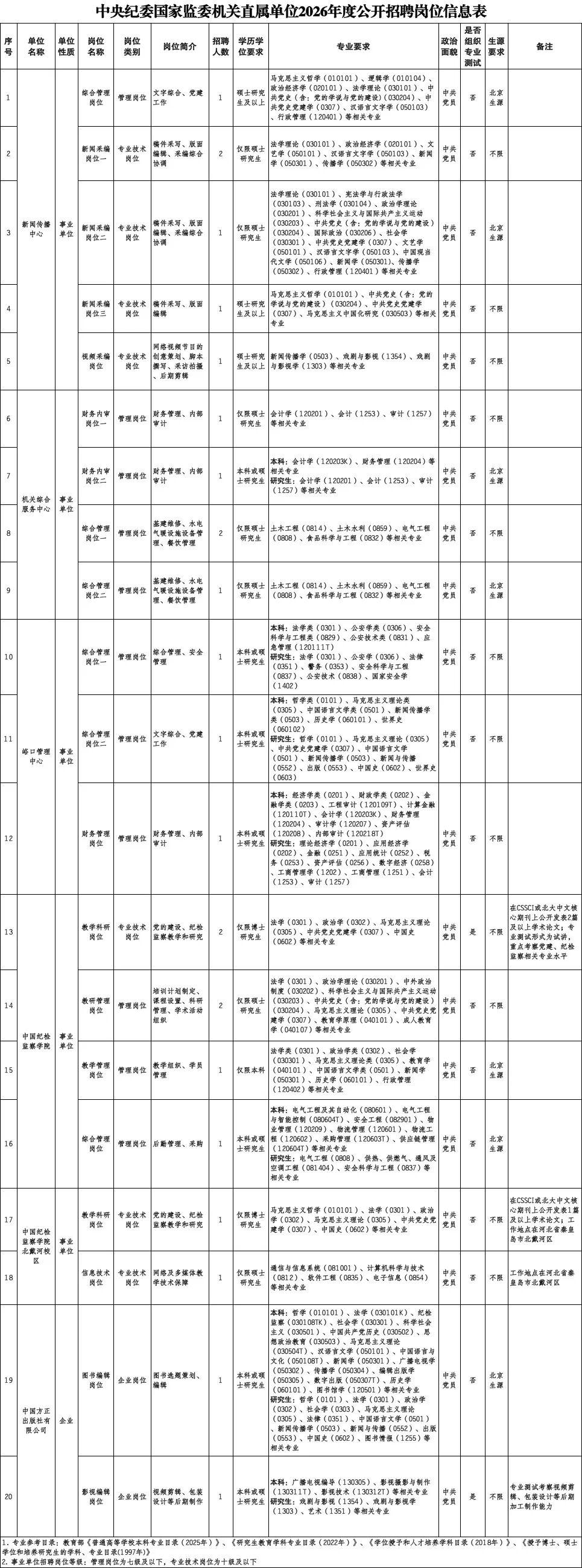 此次招聘涉及20个岗位、计划招聘24人,具体岗位及资格条件详见《中央纪委国家监委机关直属单位2026年度公开招聘岗位信息表》。其中,有关岗位专业条件参考教育部公布的专业目录(《普通高等学校本科专业目录(2025年)》、《研究生教育学科专业目录(2022年)》、《学位授予和人才培养学科目录(2018年)》、《授予博士、硕士学位和培养研究生的学科、专业目录(1997年)》)。报名应聘人员在报名时对专业有疑问的,可拨打咨询电话进行了解。