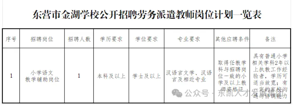 因工作需要,东营市金湖学校委托东营市东凯人力资源服务有限公司面向社会公开招聘劳务派遣教师,现将有关事项公告如下: